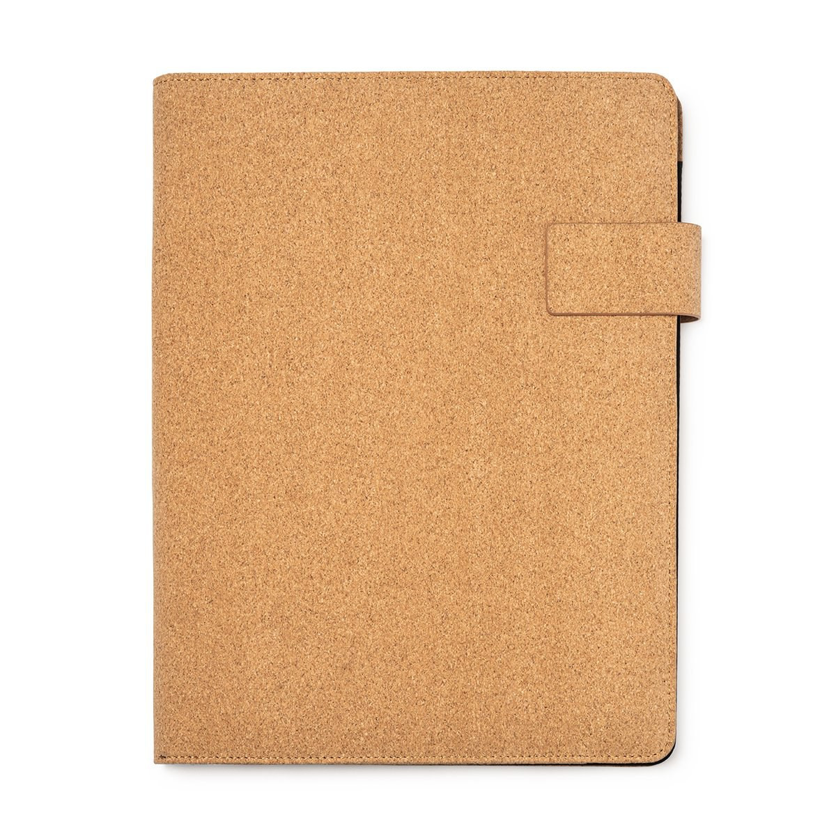 A4 portfolio in natural cork with magnetic closure. Includes pad of 30 lined, removable white sheets, 4 inside pockets and pen holder.