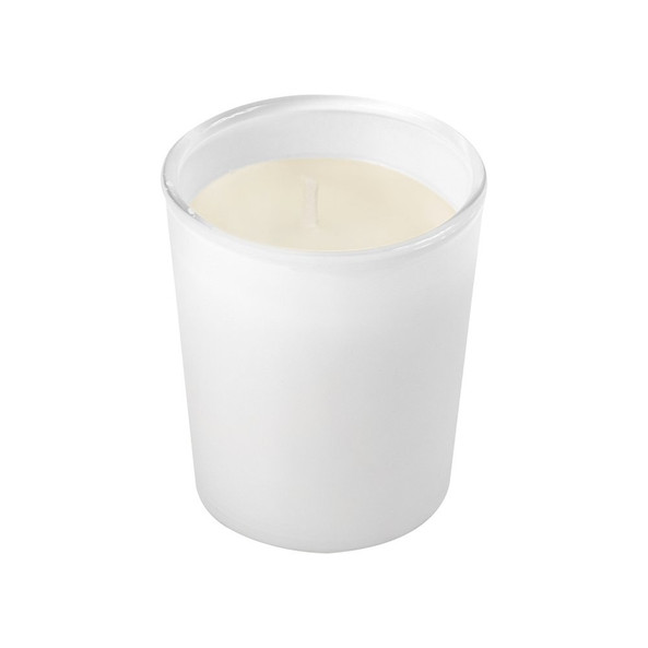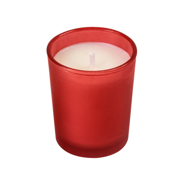 Glass candle in different colours with 55 grams of scented paraffin. Red colour smells of roses, yellow of lemon, black to linen and white to jasmine. Presented in kraft box