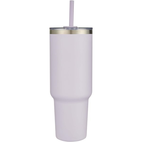 RCS certified double walled copper vacuum insulated tumbler, constructed using 91% post-consumer recycled stainless steel that will keep drinks cold for at least 24 hours. Features a Tritan straw, and a lid slider function to prevent spills. The 100% recycled plastic press-on swivel lid securely holds the straw in place, and can easily be rotated to expose the drink opening. Durable exterior powder coating. Volume capacity: 1200 ml. Hand wash only.