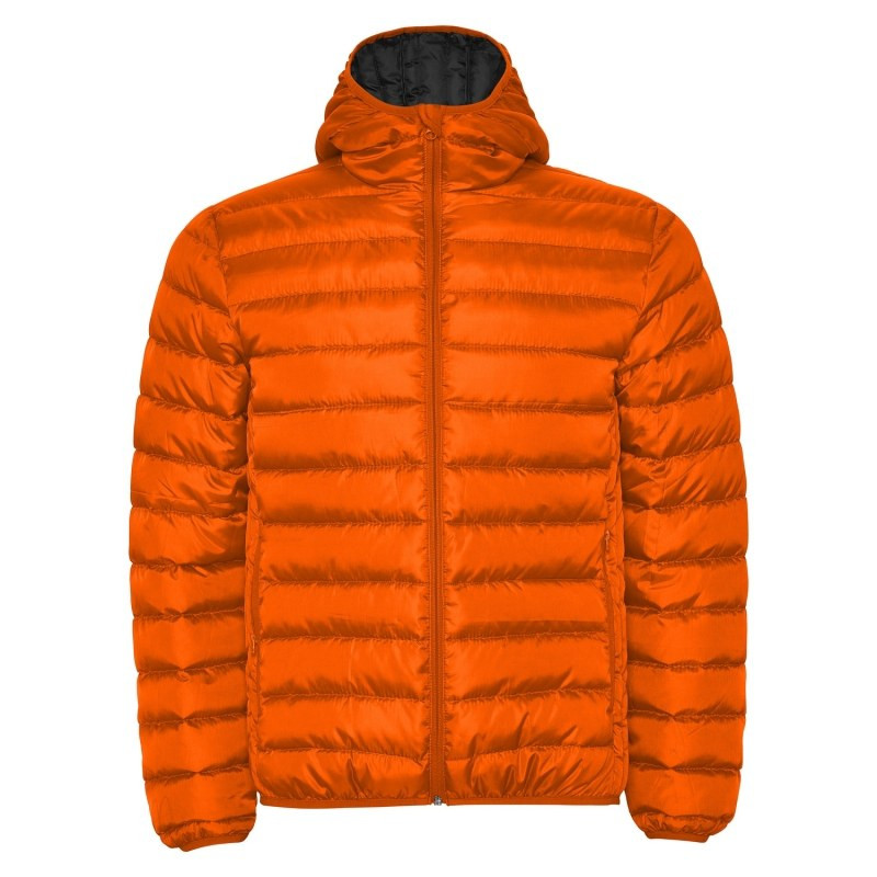 Men's feather touch quilted jacket with fitted hood. Inverted zips with matching chin protector. Two front pockets with zip. Matching elastic trim in cuffs, hem and hood. Contrasting inner lining. Stow carry bag included. Light and foldable garment. Water resistant. Wind-proof model.