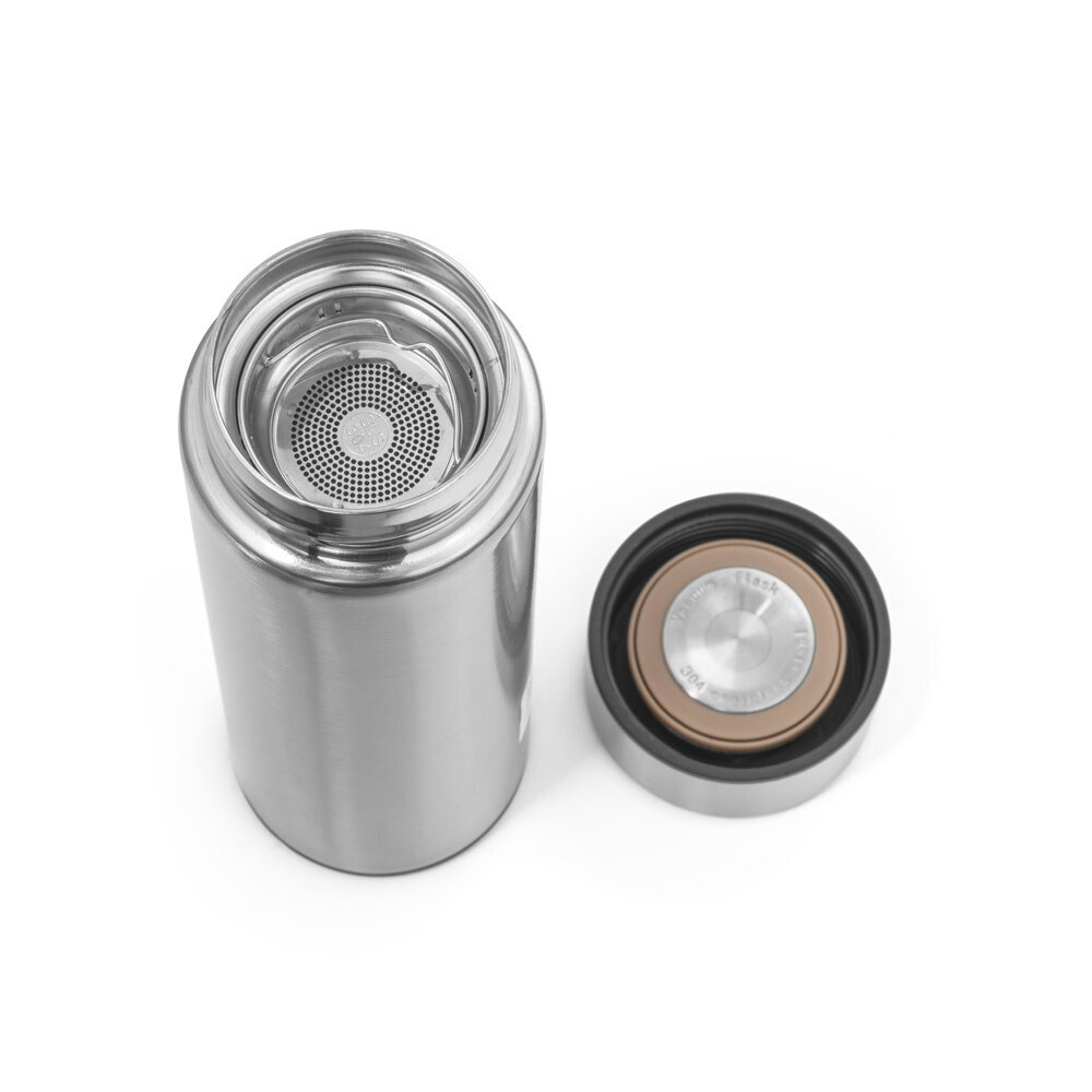 Stainless steel bottle with lid with an integrated digital thermometer. Double vacuum insulated body with capacity up to 470 mL. Includes infuser for tea. Keeps drinks hot for 8h and cold for 24h. Supplied in a gift box
