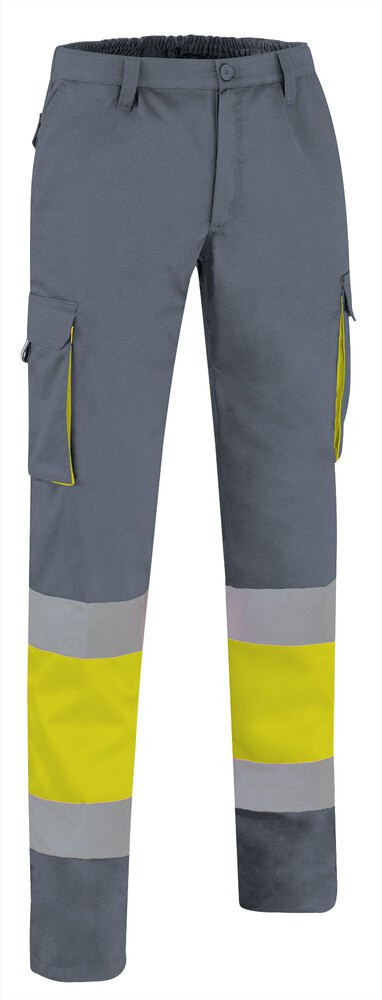 High Visibility Two-Tone Multi-Pocket Trousers. Made of a sturdy cotton twill fabric blended with polyester for strength and durability, includes two sewn reflective tapes on leg cuffs to enhance user visibility. Garment certified as a High Visibility Category II PPE based on 13688 and 20471 standards, Class 1.Back elasticated waistband for a better fitting, double main seams and extra high-wear reinforcements with safety bartacks, ensuring long-lasting strength and durability. Two slanted hip pockets, two gusseted side pockets and two back pockets, all four with velcro flap closure and a two-tone reflective puller for easy opening and a secure and convenient storage.Suitable marking methods: screen printing, embroidery, transfer printing, vinyl application. Ideal as workwear and uniforms.