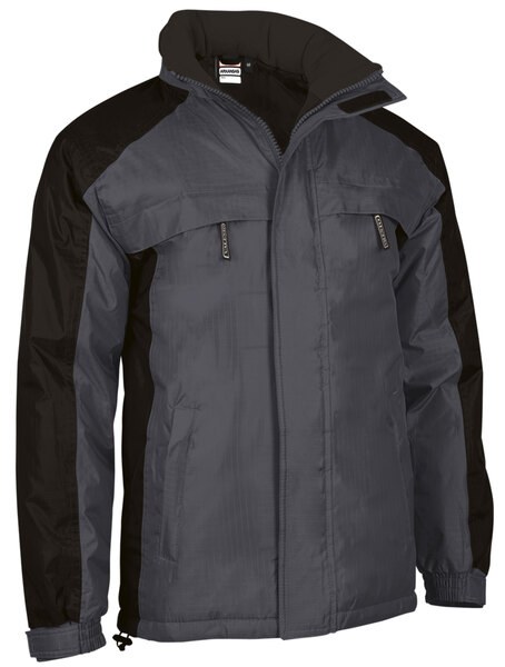 Two-Tone Waterproof Hooded Parka. Made of long-lasting Ripstop outer waterproof fabric with smooth inner lining, inner quilting and anti-pilling fleece lining on neck and pockets for ensuring excellent thermal insulation. Thermo-sealed seams that prevent water leaks and hidden hood that can be easily opened and closed by velcro closure and also can be used as a raincoat. Straight-cut waist with elastic drawstring and stopper, adjustable cuffs with velcro fastening for a better fit and added comfort. Two slanted waist pockets, two chest pockets and an inner left chest pocket, all zippered, for a secure and convenient storage. Includes an inside back zip for easy marking with different methods: screen printing, embroidery, transfer printing, shields, vinyl application. Ideal as promotional clothing, workwear and outdoor activities.